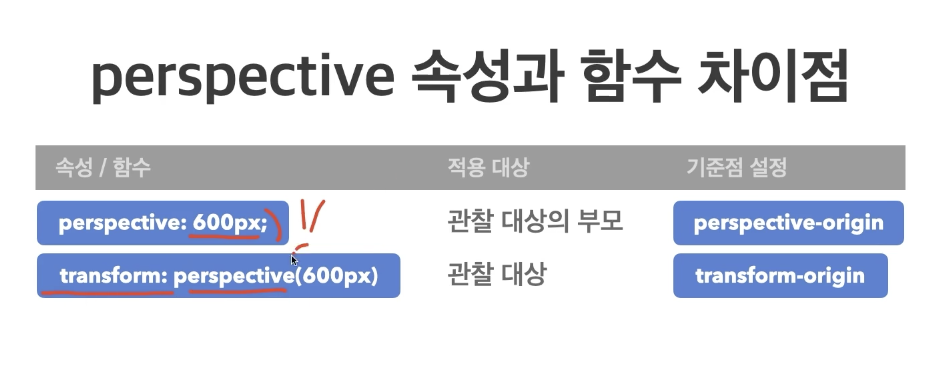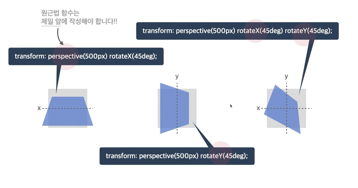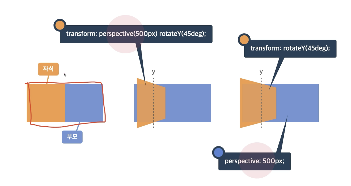 | perspective | perspective: 500px; | 선택한 요소의 원근점 거리를 설정합니다. |