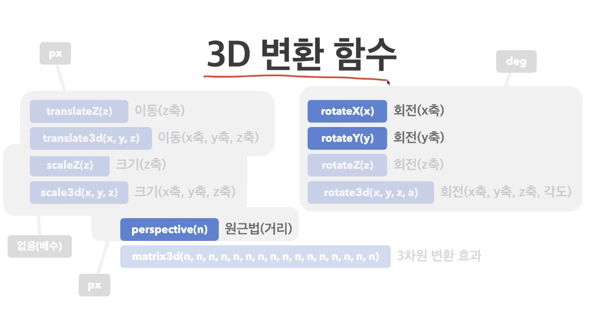 | 3d변환 | translate3d(x,y,z) | scale3d(x,y,z) | rotate3d(ax,y,z,angle) | |