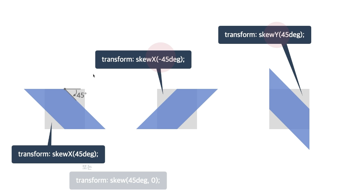 | x축 변환 | translateX(x) | scaleX(x) | rotateX(angle) | skewX(angle) |