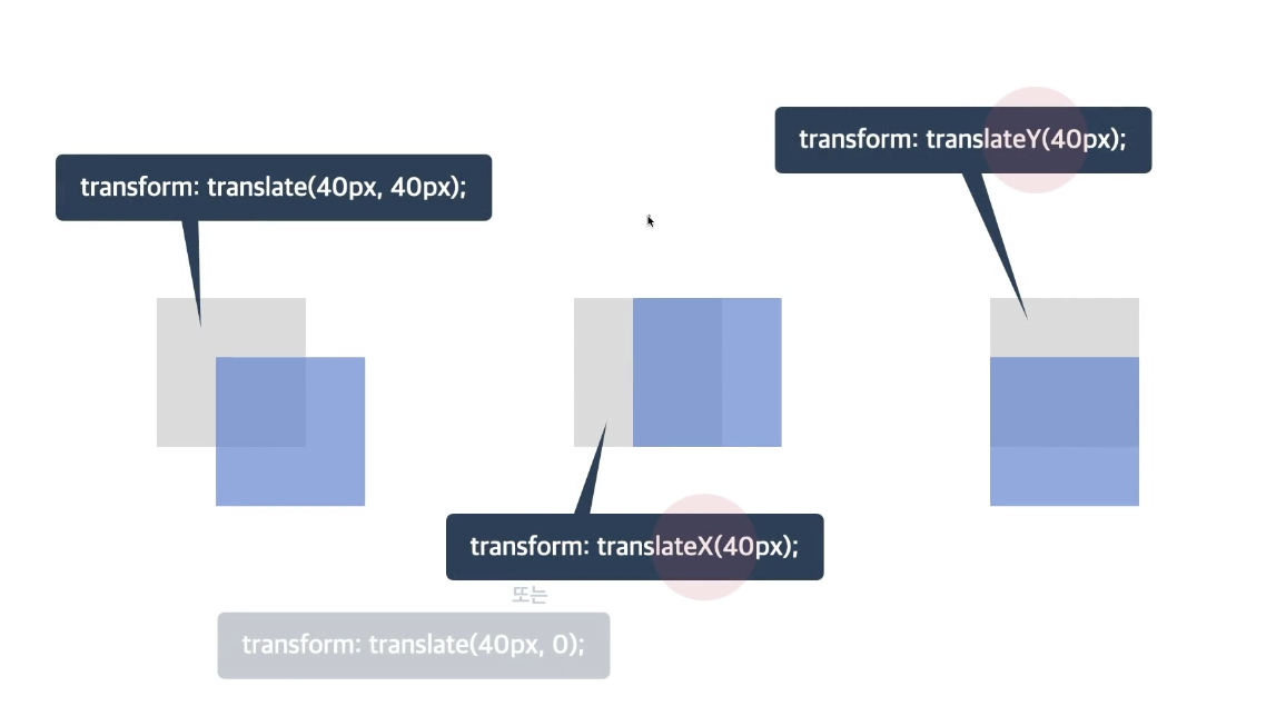 | translate | transform: translate(10px, 20px); | 선택한 요소의 X좌표, Y좌표 이동을 나타냅니다. |