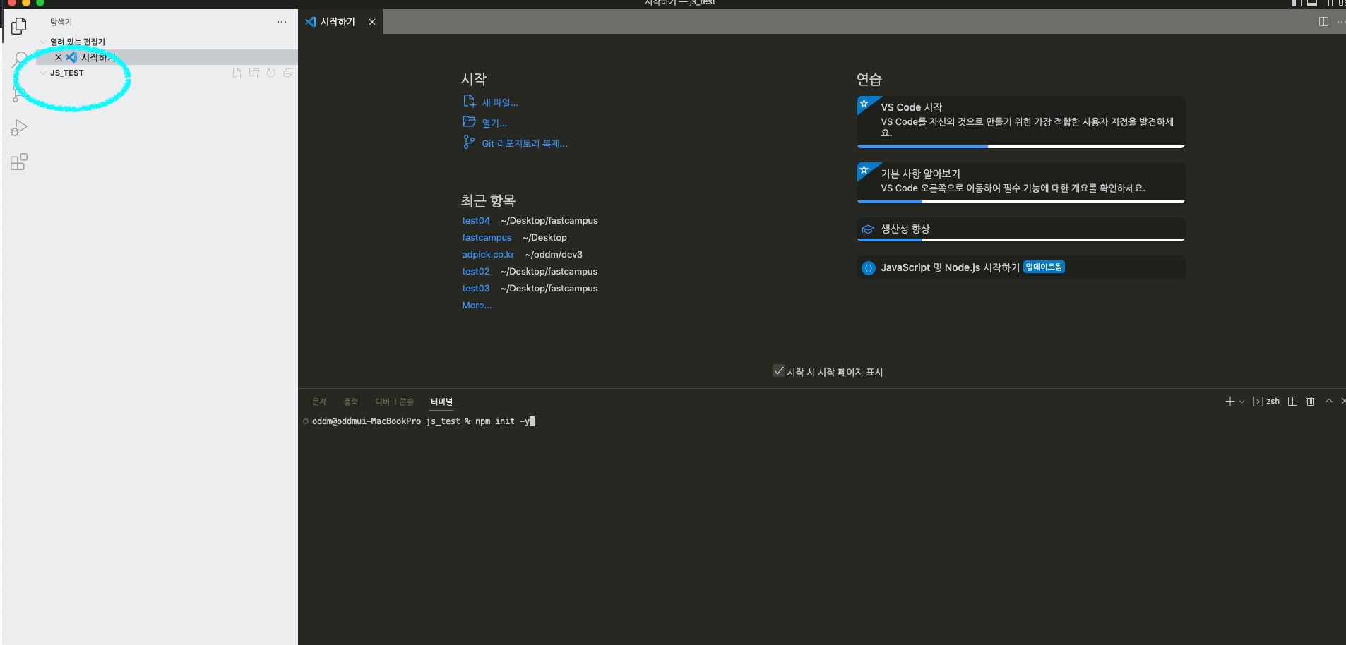 1. js_test 폴더를 하나 만든후, visualstudio를 엽니다. 터미널에서 npm init -y를 하여 package.json을 만들어줍니다.