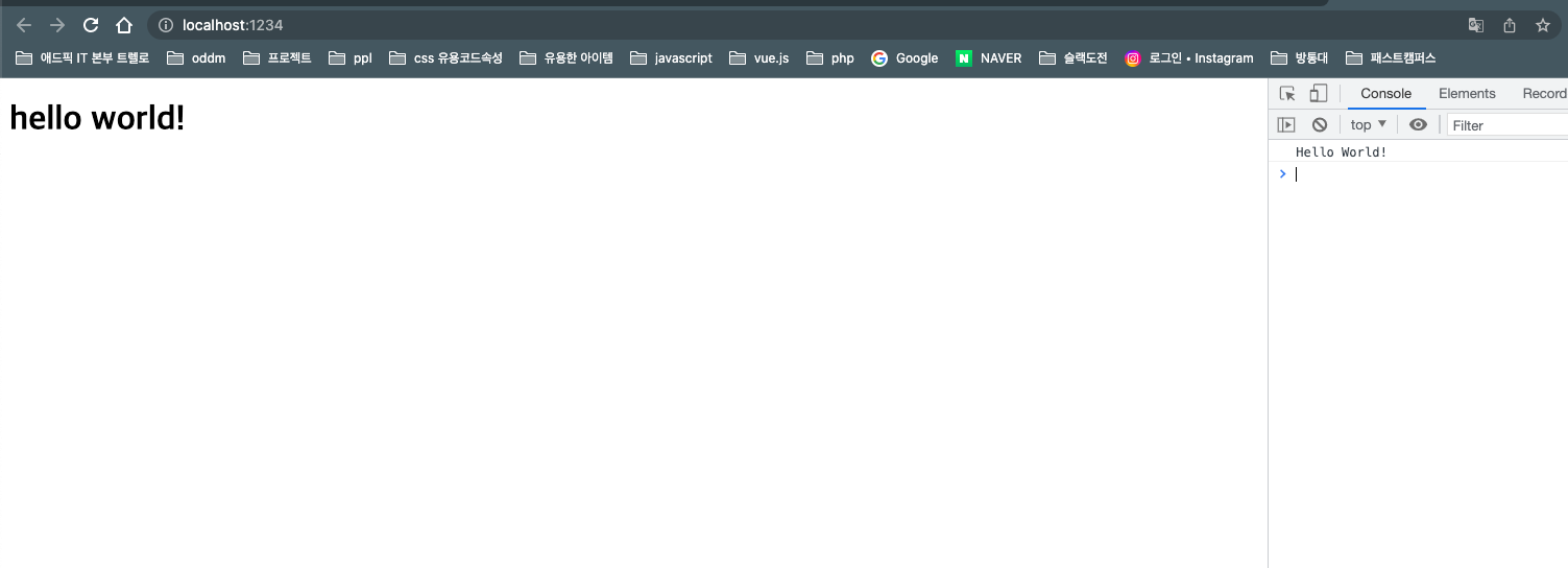 4. main.html과 main.js파일을 만든후에 간단히 내용을 적고, 로컬에서 npm run dev 명령을하여 실행시켜 화면을 확인해줍니다.